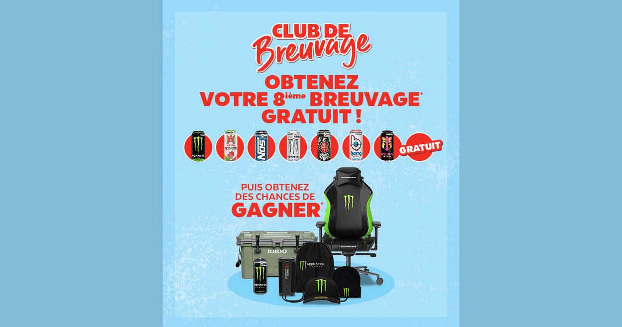 Inscrivez-vous au Concours Couche-Tard – Visitez et gagnez. À gagner : canettes Monster, ensembles-cadeaux, glacière ou une chaise de jeu.