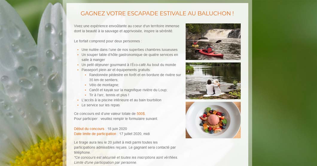 Vivez une expérience envoûtante qui inspire la sérénité en participant au Concours Le Baluchon Gagnez votre escapade estivale. D’une valeur de 500$.