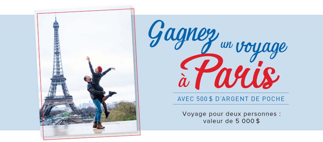 Courez la chance de gagner un voyage pour deux personnes à Paris d’une valeur de 5 000 $ comprenant 500 $ d’argent de poche.