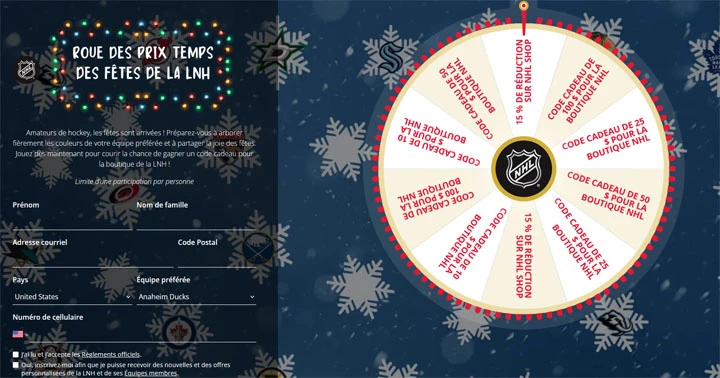 Le Concours LNH – Roue des prix du temps des Fêtes est ouvert aux résidents légaux actuels des États-Unis (y compris le District de Columbia) ou du Canada.