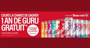 Inscrivez-vous au Concours Dépanneurs Beau-soir – 1 an de GURU gratuit et courez la chance de gagner 384 canettes de 355 ml, saveurs variées.