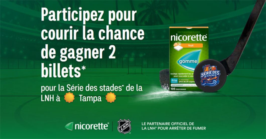 Inscrivez-vous au Concours Nicorette – Série Stadium et courez la chance de gagner un voyage VIP pour 2 à Tampa Bay pour un match de la LNH.