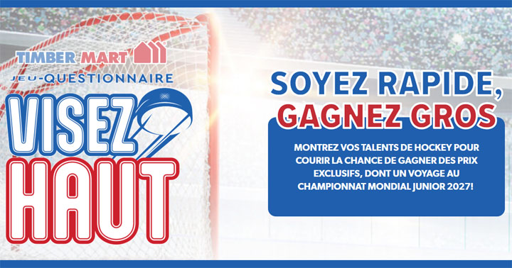 Inscrivez-vous au Concours Timber Mart – Visez haut et courez la chance de gagner un voyage au Championnat mondial junior de hockey.